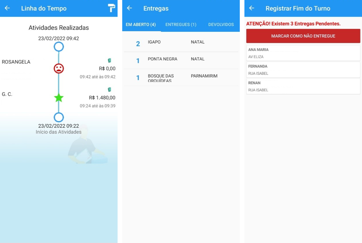 Utilizado pela equipe de entregadores da empresa, ele é responsável por realizar o acompanhamento completo da equipe, desde o registro do início do turno e visualização das entregas planejadas para a jornada, até o cadastro de ocorrências e do fim do turno, permitindo que o entregador possa visualizar sua linha do tempo durante aquela jornada de trabalho.