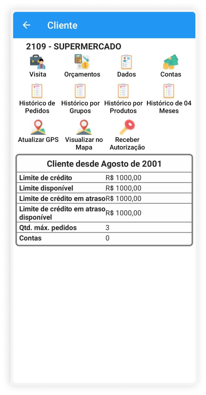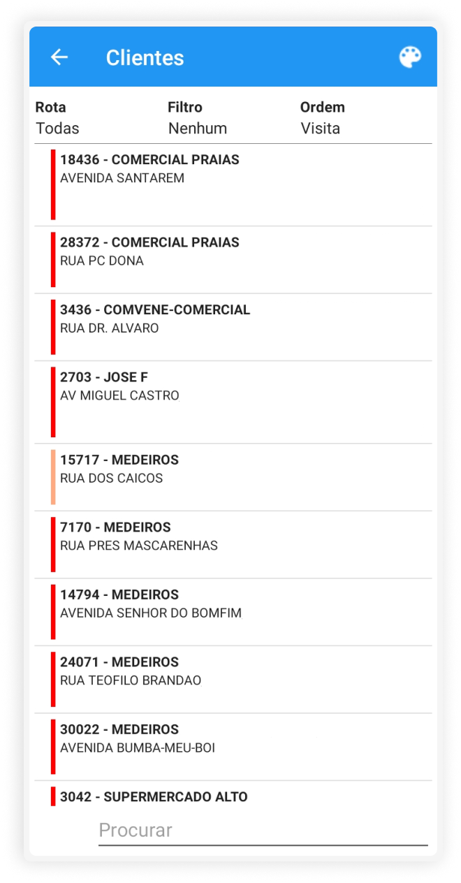 Visualização de todos os clientes que um vendedor deve visitar naquele dia, com legenda em forma de barra indicando a situação da visita. Também possibilita a visualização de detalhes de cada cliente e o controle de dias de visitas.