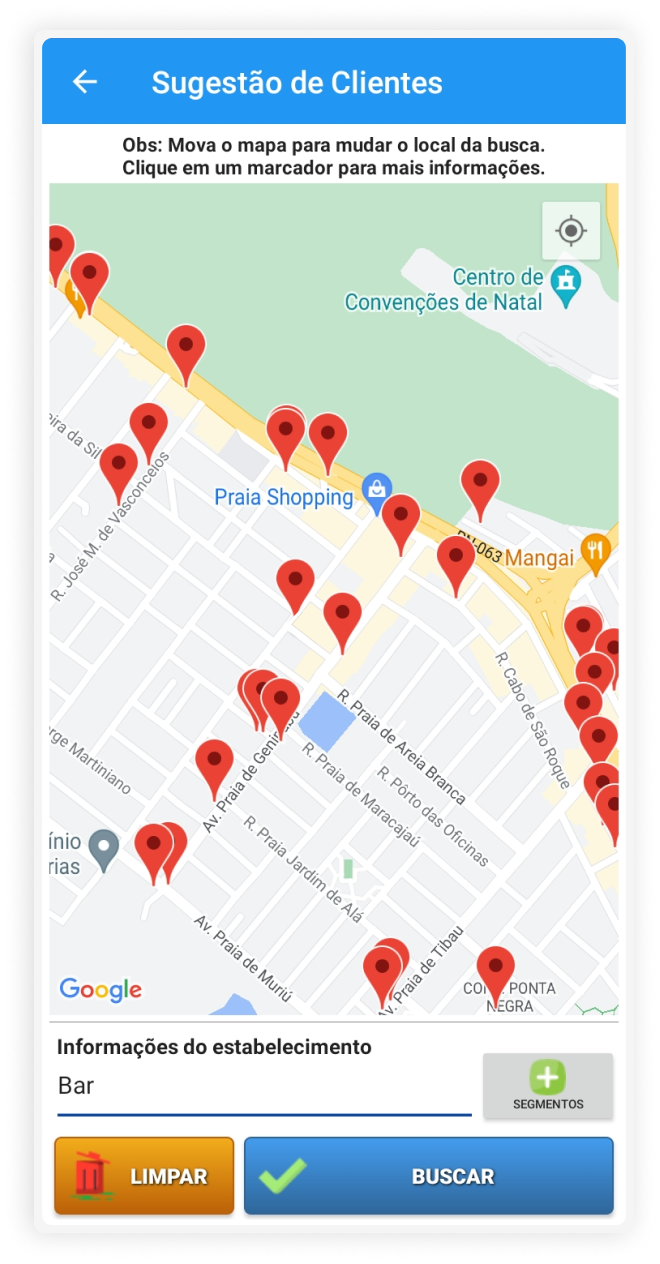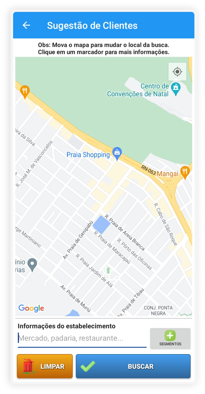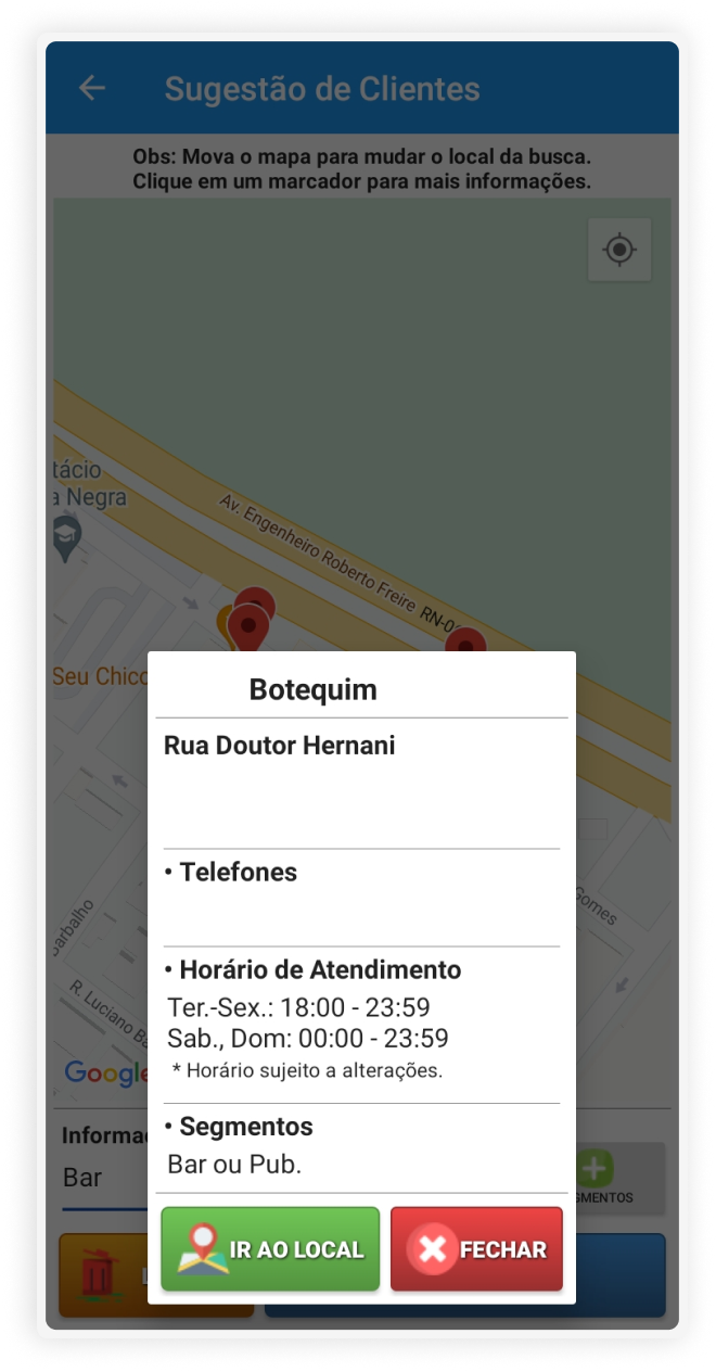 Com base no tipo de estabelecimento (mercado, bar, restaurante), é possível a partir da integração com o Google Maps sugerir novos clientes para o seu negócio, mostrando todas as informações sobre esse estabelecimento.