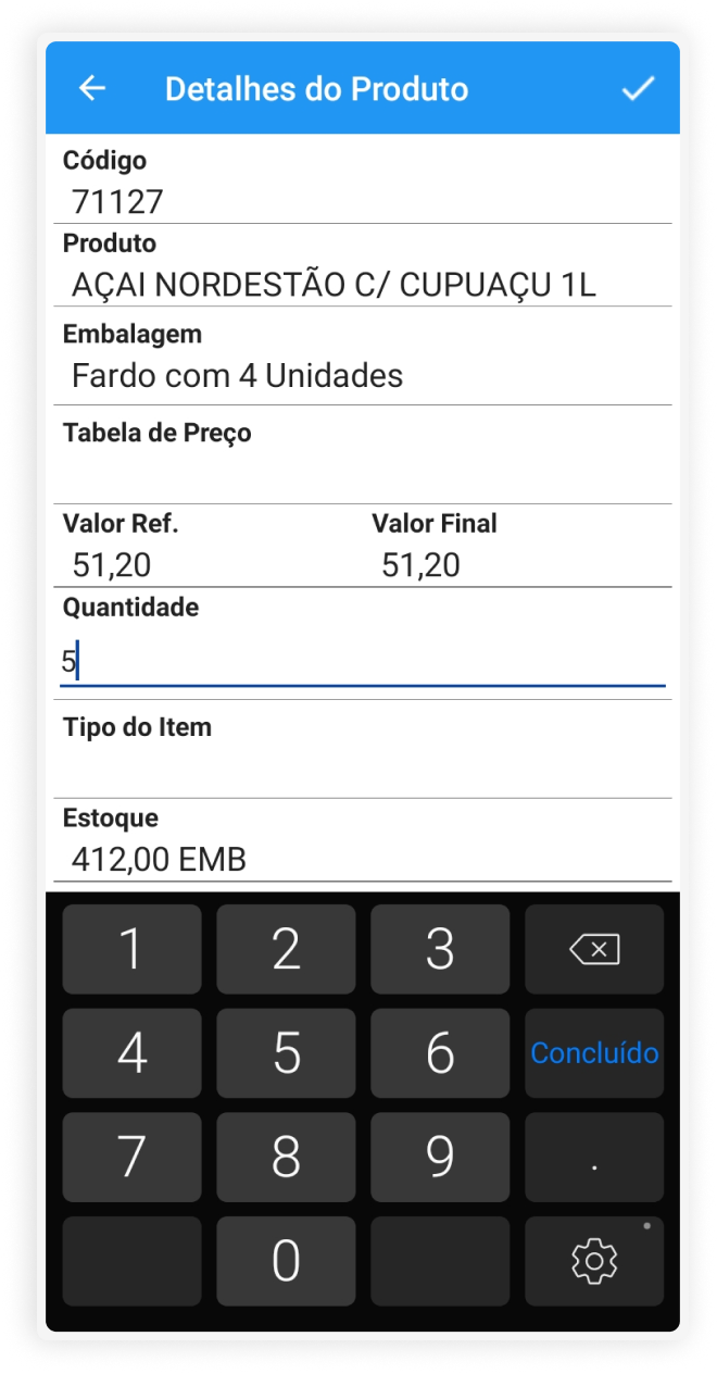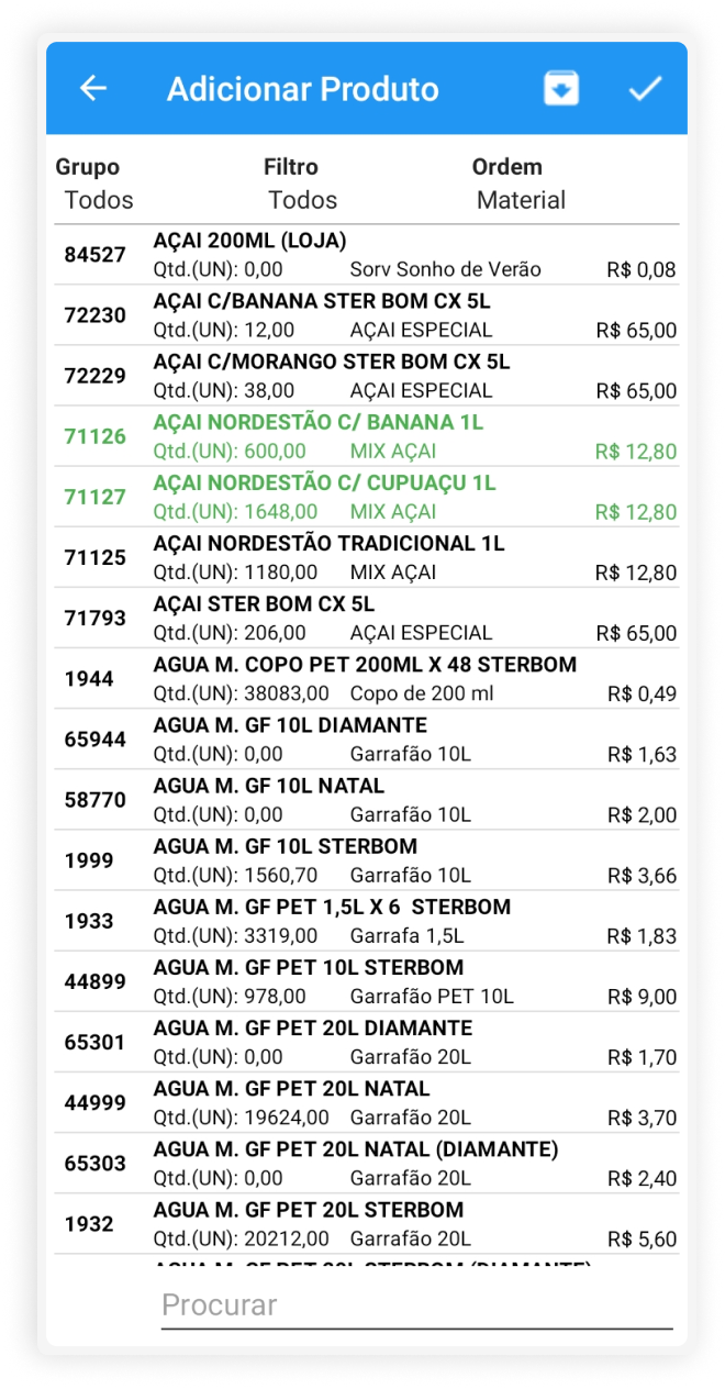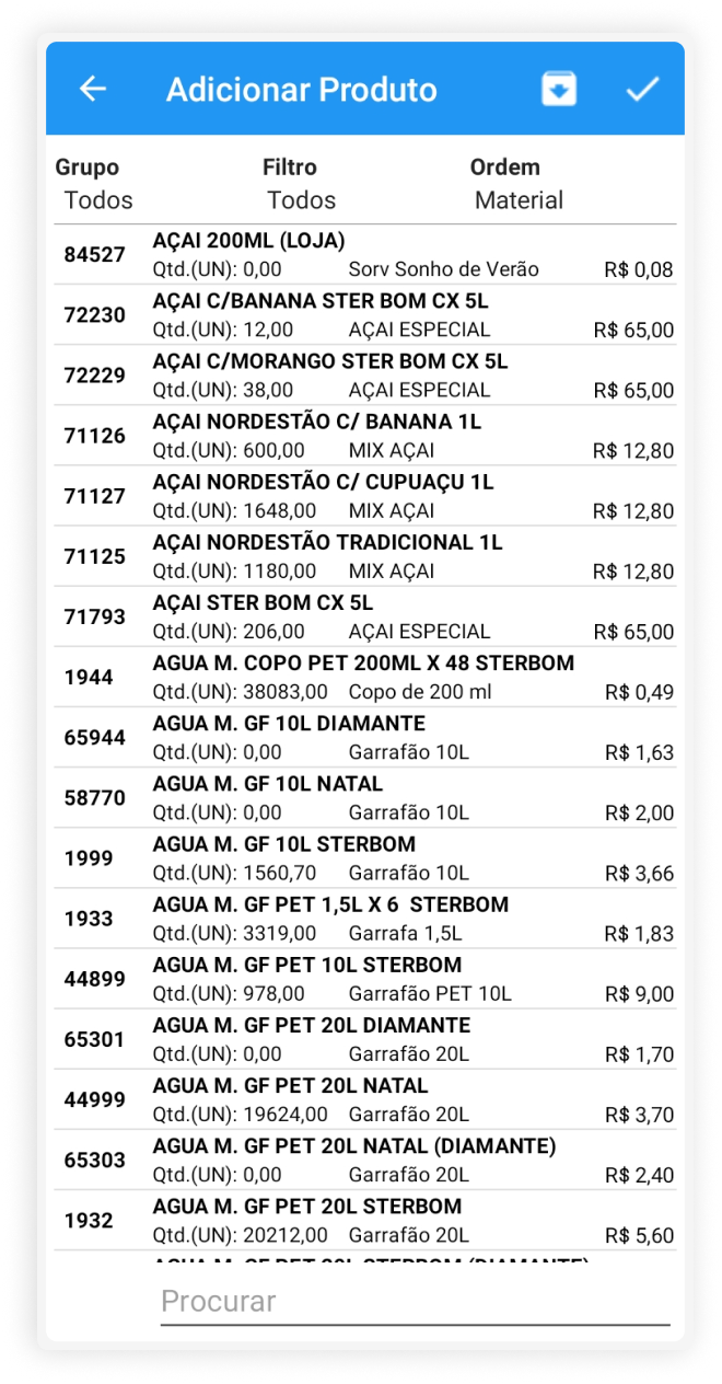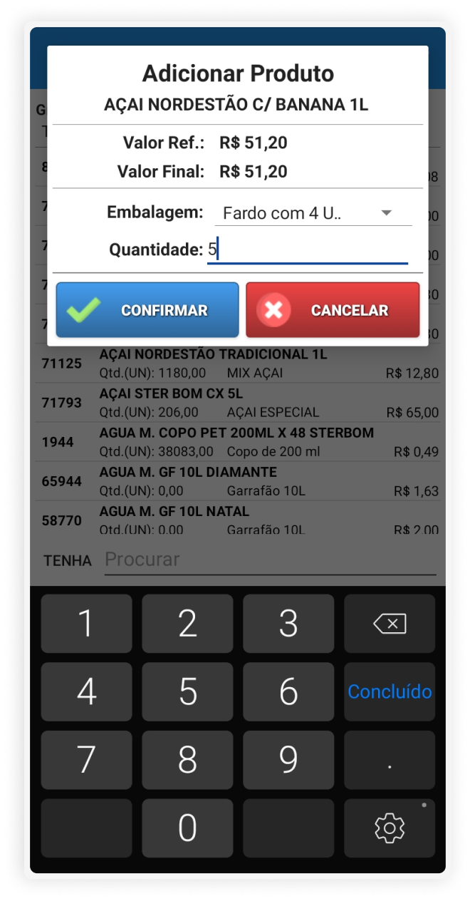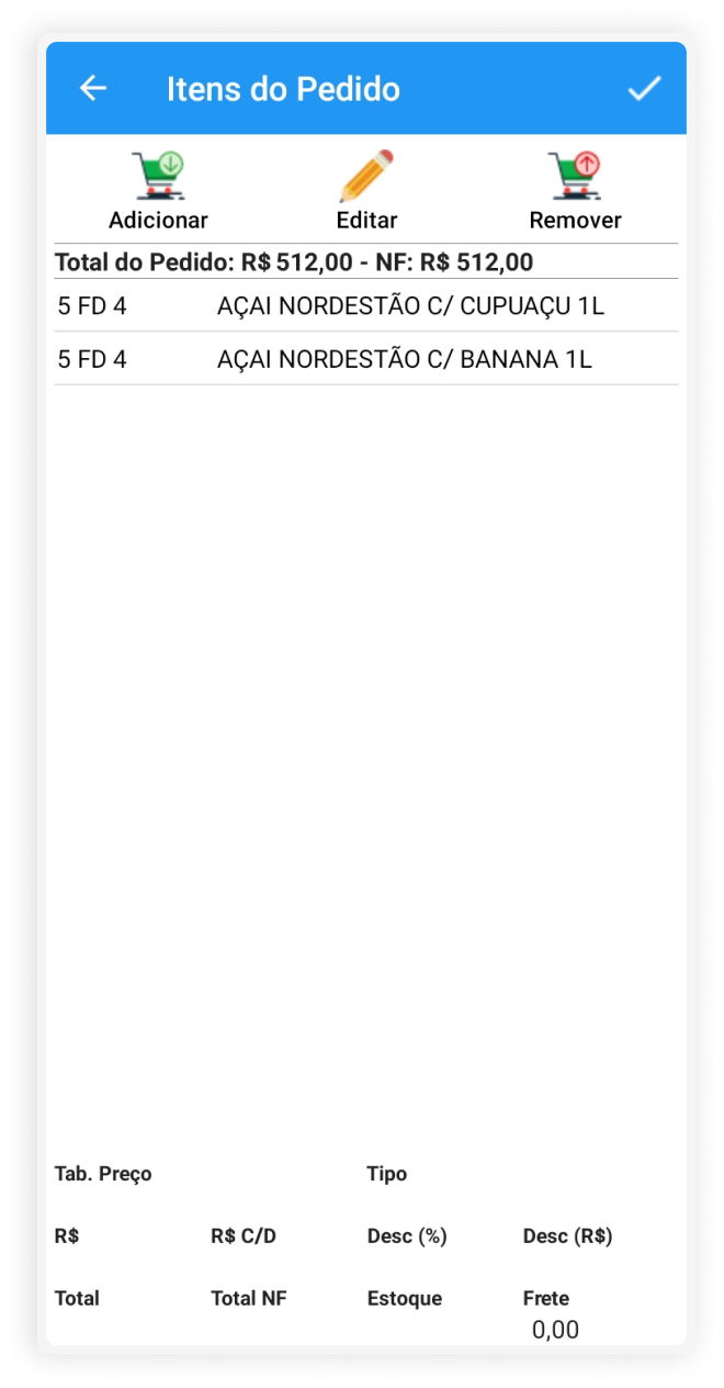 Após a confirmação do início da visita, inicia-se o processo de registro de pedidos para um cliente. Adicionam-se os produtos ao carrinho, visualizando-se todas as informações sobre um determinado produto, e ao final, é mostrado o preço total do pedido.