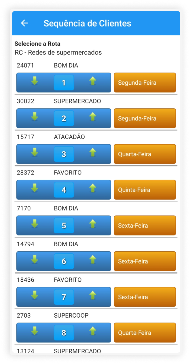 Funcionalidade responsável pela organização da rota que o vendedor fará naquele dia para visitar os seus clientes. O vendedor pode organizar sua própria sequência de visitas.